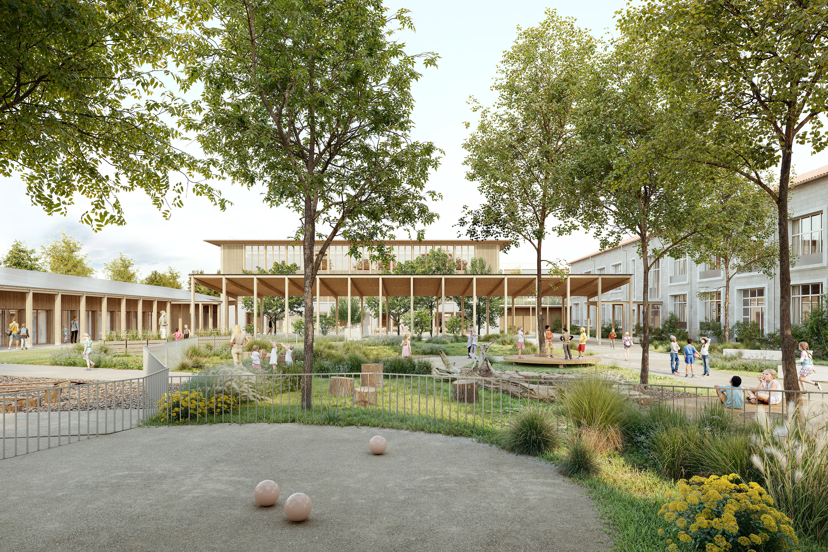 ENJEUX / RE2020 SEUIL 2028 – MATERIAUX BIOSOURCES (BOIS + PAILLE) – REVERDISSEMENT DES COURS, LARGEMENT PLANTEES – COURS OASIS