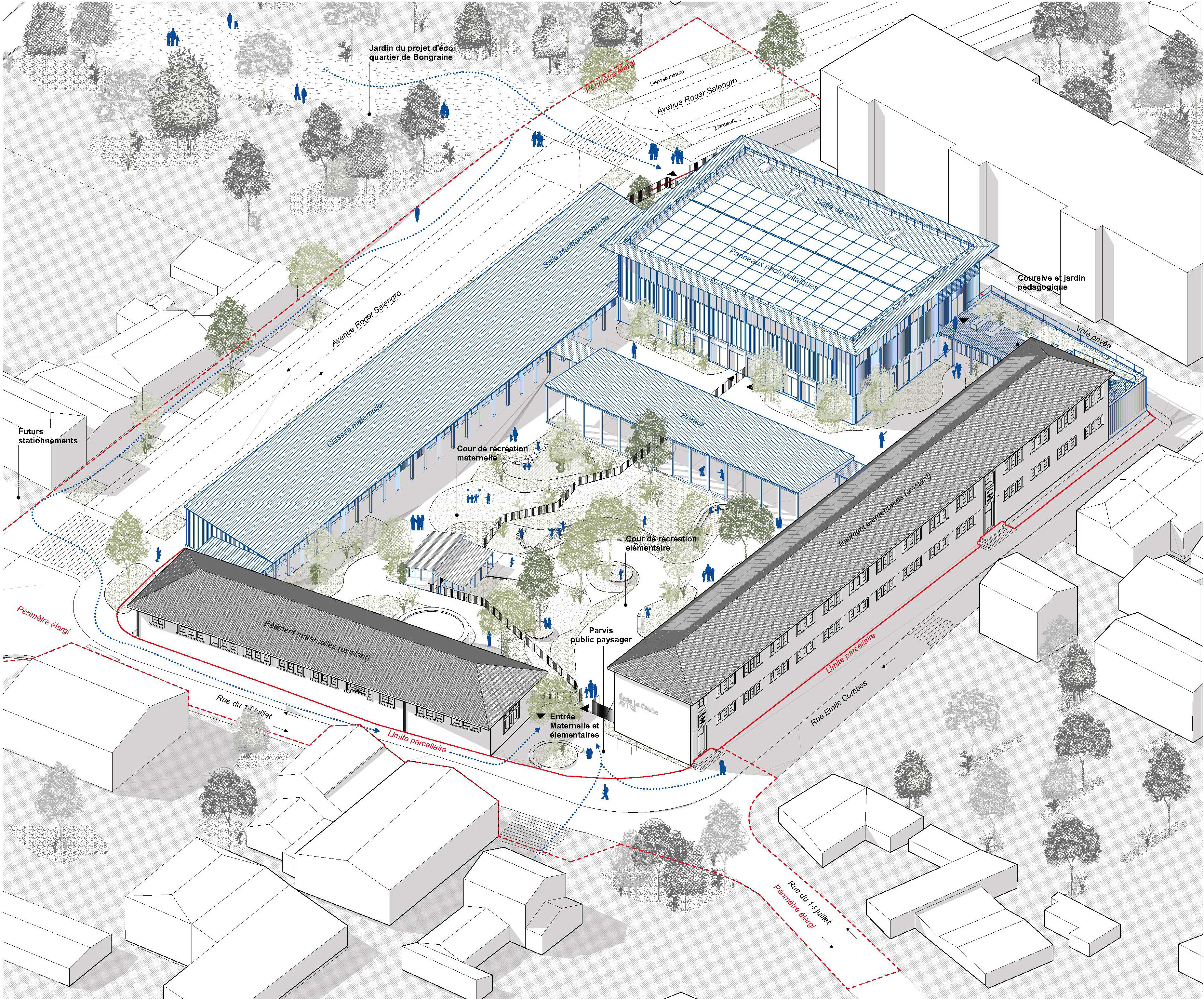 ENJEUX / RE2020 SEUIL 2028 – MATERIAUX BIOSOURCES (BOIS + PAILLE) – REVERDISSEMENT DES COURS, LARGEMENT PLANTEES – COURS OASIS